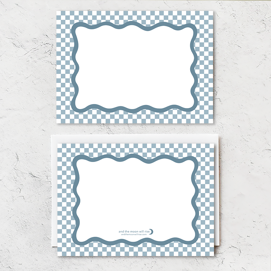 Set of 10 flat notecards with white envelopes; blue and white checkerboard and blue scallop surrounds writeable white space in middle