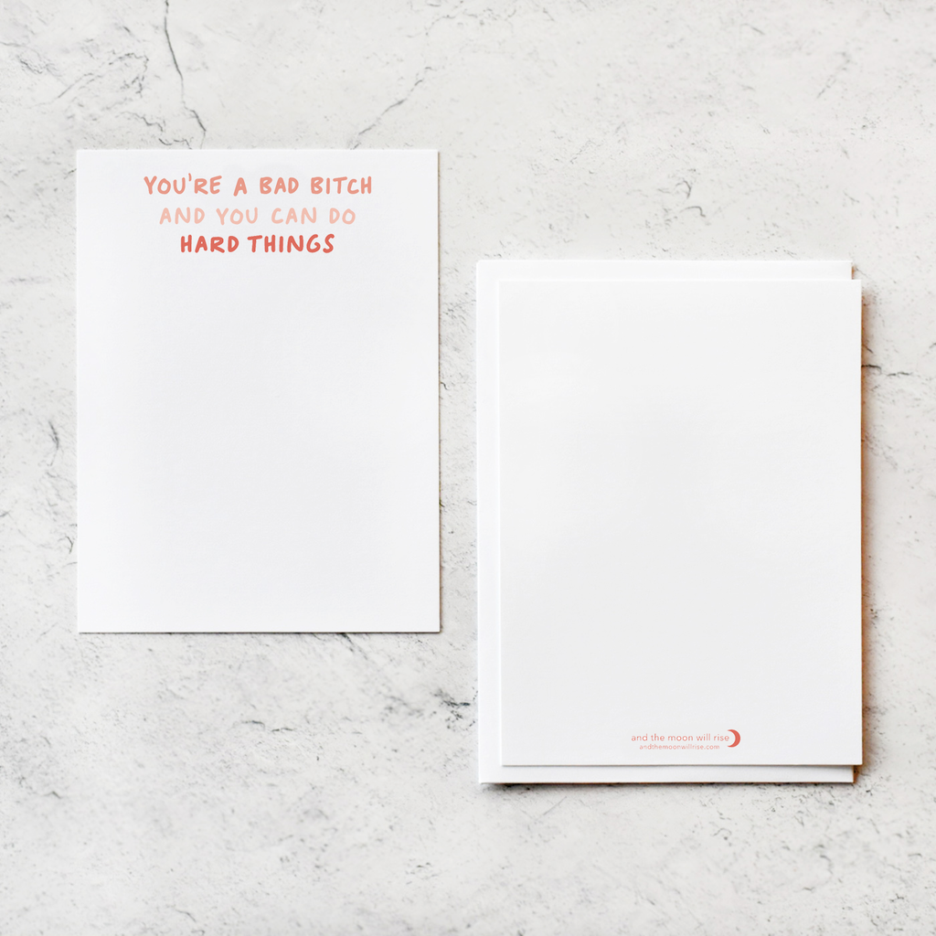 You're a bad bitch and you can do hard things in handwritten coral font on white background; 10 flat notecard set with envelopes